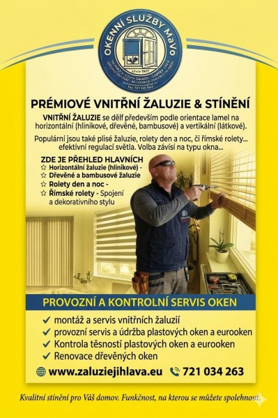 Provádím odbornou montáž a servis interiérových žaluzií a další interiérové stínící techniky např. vertikálních žaluzií, plisé žaluzií - plisé rolety, textilních žaluzií, rolet Den a Noc, látkových stínících i dekorativních rolet a okenních a dveřních sítí proti hmyzu.